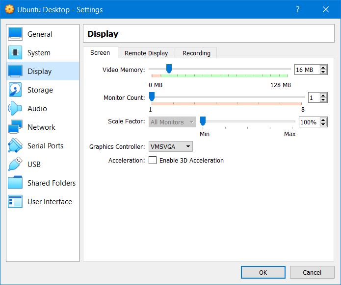 I returned to the Oracle VM VirtualBox Manager window and selected ‘Settings’. Then navigated to the Display tab. Changed the Graphics Controller setting to ‘VBoxSVGA’ and clicked OK (ignoring the warning).