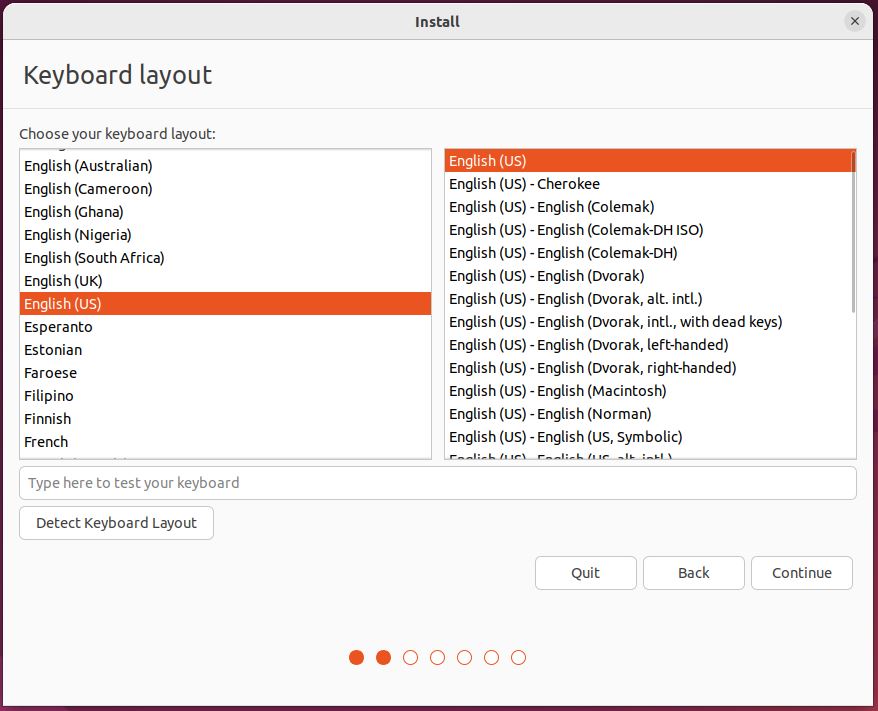 In the “Keyboard layout” window, as the preferred keyboard layout, ‘English (US)’ is selected.