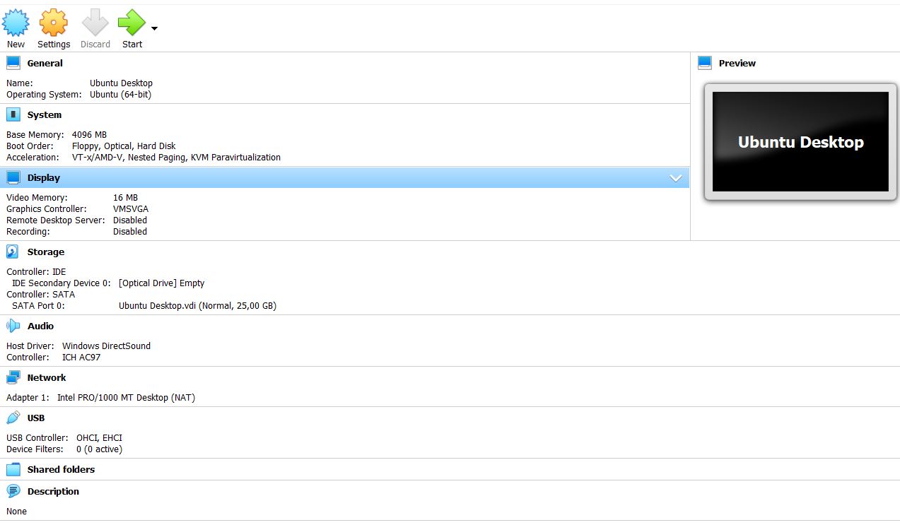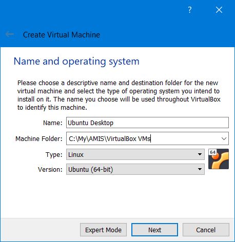For installing Ubuntu Desktop using VirtualBox, I followed the instructions “How to run Ubuntu Desktop on a virtual machine using VirtualBox”: