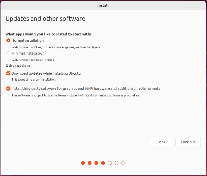 In the “Updates and other software” window, I kept the defaults: ‘Normal installation’ and ‘Download updates while installing Ubuntu’.