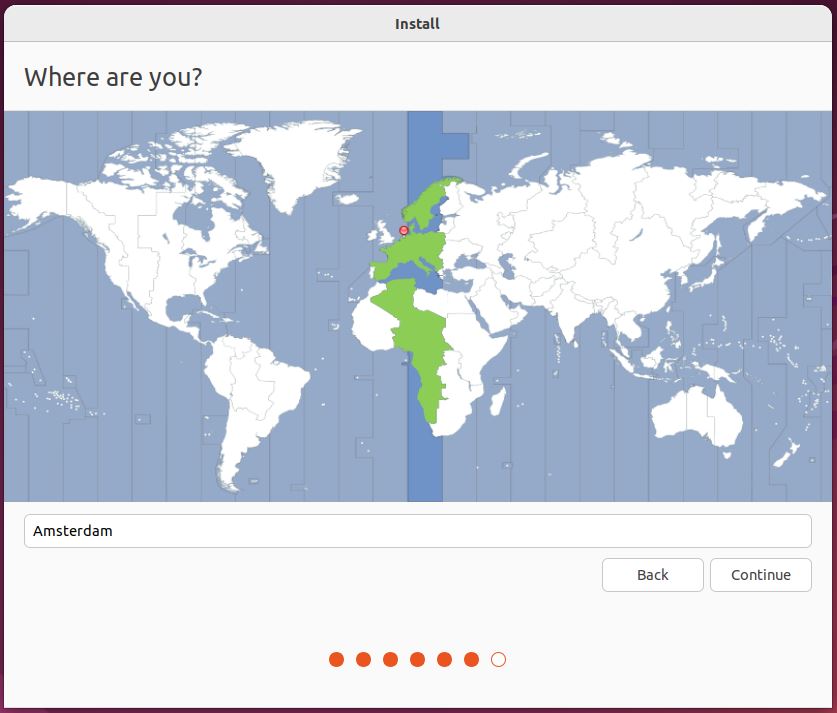 In the “Where are you?” window, I selected my location and timezone from the map screen and clicked on the ‘Continue’ button. This information will be detected automatically if you are connected to the internet.