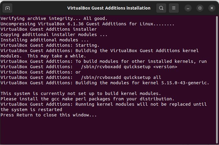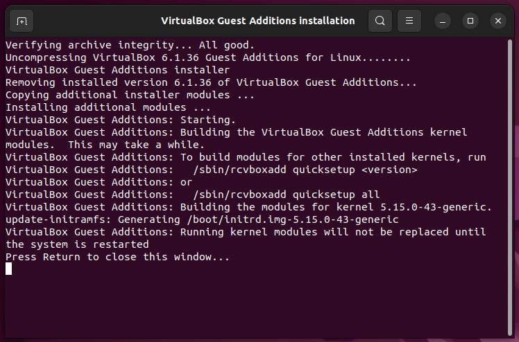 After that, the VirtualBox Guest Additions installation started.