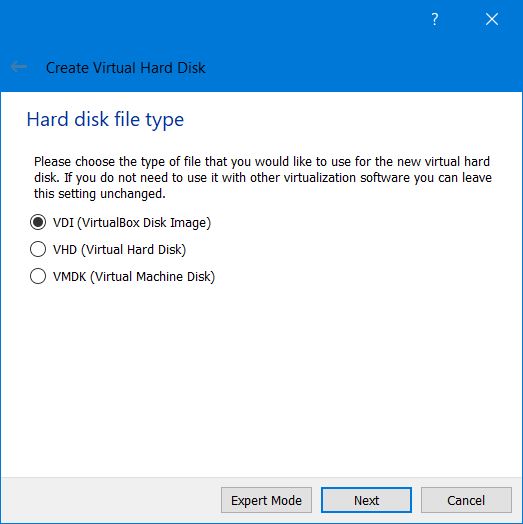 The type of hard disk depends on whether you use VirtualBox with other VM software. I kept this as a VDI.