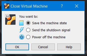 And I closed the system, via the VirtualBox menu, File | Close | Save the machine state.