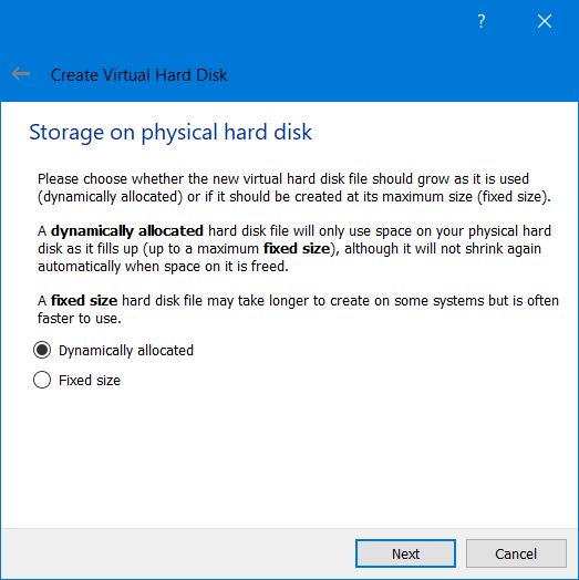 Then you can choose whether the hard disk is dynamically allocated (up to the limit we will set on the next screen), filling up as the VM requires it. Otherwise, we can tell it to allocate the full amount of memory right from the start. This will improve performance but may take up unnecessary space. I kept it as dynamically allocated.
