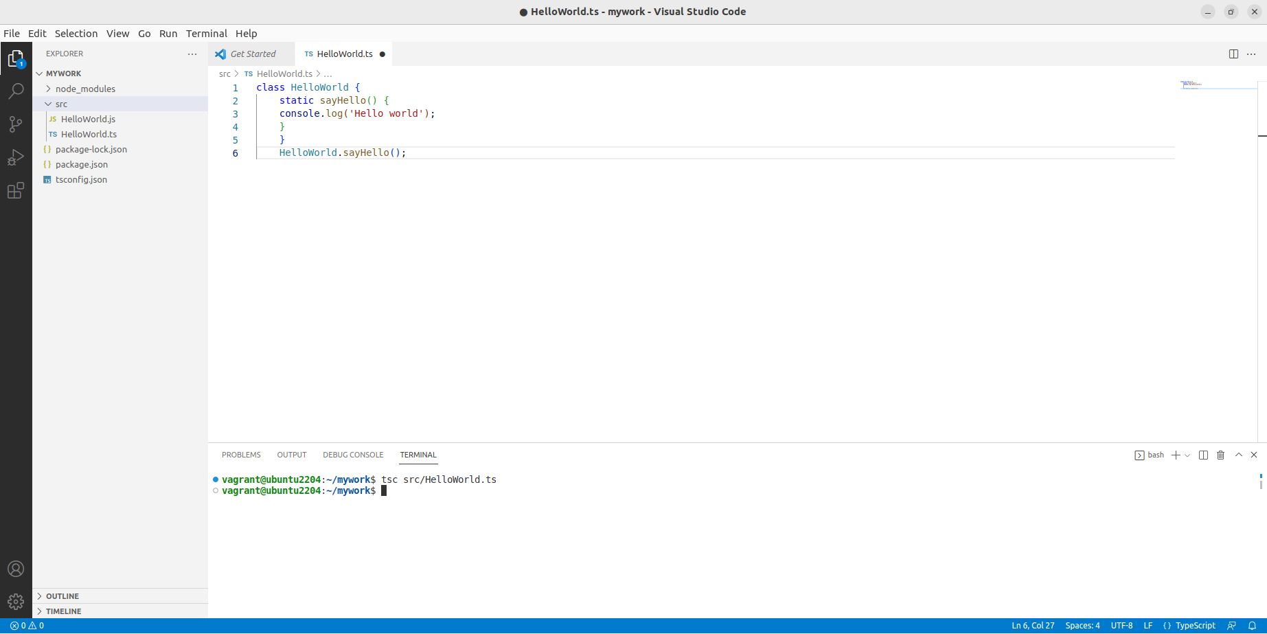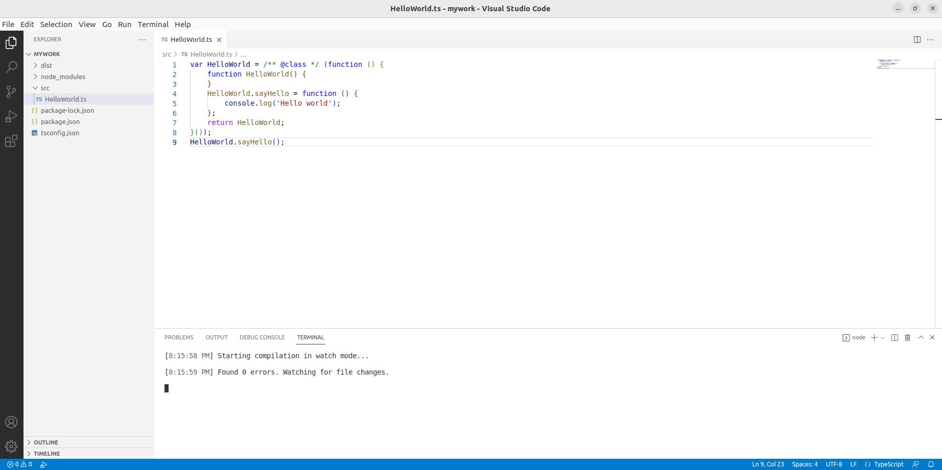 In order to compile this TypeScript code, I opened the Integrated Terminal (via View | Terminal).