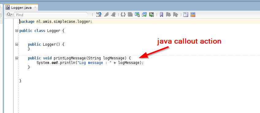 Our java code is a logger: it will do a simple println of a string, with 1 argument. The result will be visible in the server log file.