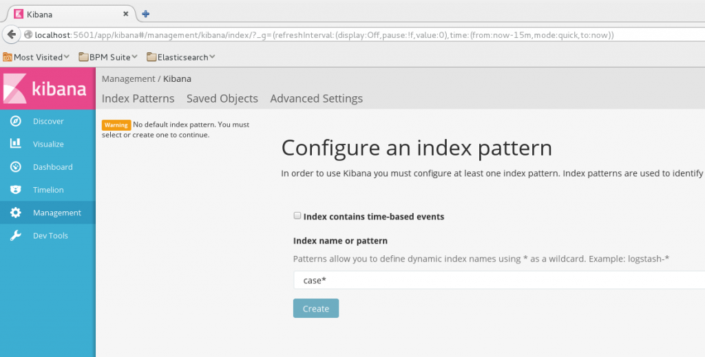 On this page you are prompted for an index pattern: the pattern identifies the Elasticsearch indexes that you want to access from Kibana. With the data set from the previous blog, the index pattern that we will use is ‘case*’. Un-check the tickbox ‘index contains time based events’, like below:
