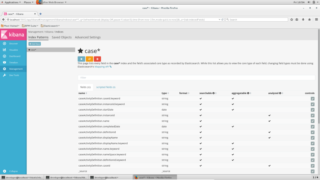 [developer@localhost ~]$ cd [developer@localhost ~]$ cd kibana/kibana-5.0.0-linux-x86_64/ [developer@localhost kibana-5.0.0-linux-x86_64]$ ls bin data node optimize plugins src config LICENSE.txt node_modules package.json README.txt webpackShims [developer@localhost kibana-5.0.0-linux-x86_64]$ cd bin [developer@localhost bin]$ ./kibana log [15:21:17.204] [info][status][plugin:kibana@5.0.0] Status changed from uninitialized to green - Ready log [15:21:17.259] [info][status][plugin:elasticsearch@5.0.0] Status changed from uninitialized to yellow - Waiting for Elasticsearch log [15:21:17.290] [info][status][plugin:console@5.0.0] Status changed from uninitialized to green - Ready log [15:21:17.466] [info][status][plugin:timelion@5.0.0] Status changed from uninitialized to green - Ready log [15:21:17.470] [info][listening] Server running at http://localhost:5601 log [15:21:17.471] [info][status][ui settings] Status changed from uninitialized to yellow - Elasticsearch plugin is yellow log [15:21:22.484] [info][status][plugin:elasticsearch@5.0.0] Status changed from yellow to yellow - No existing Kibana index found log [15:21:22.558] [info][status][plugin:elasticsearch@5.0.0] Status changed from yellow to green - Kibana index ready log [15:21:22.559] [info][status][ui settings] Status changed from yellow to green - Ready